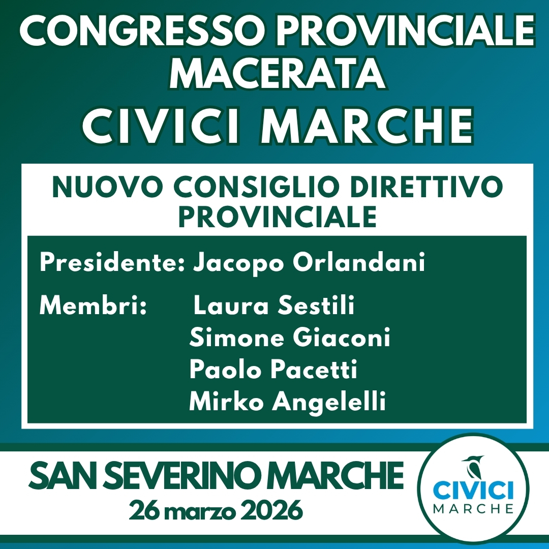 Il percorso dei congressi provinciali si è completato il 26 marzo 2026 a Macerata con l’elezione di Jacopo Orlandani Presidente, insieme a Laura Sestili, Simone Giaconi, Paolo Pacetti e Mirko Angelelli.