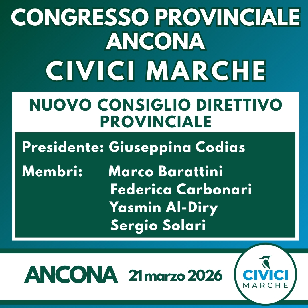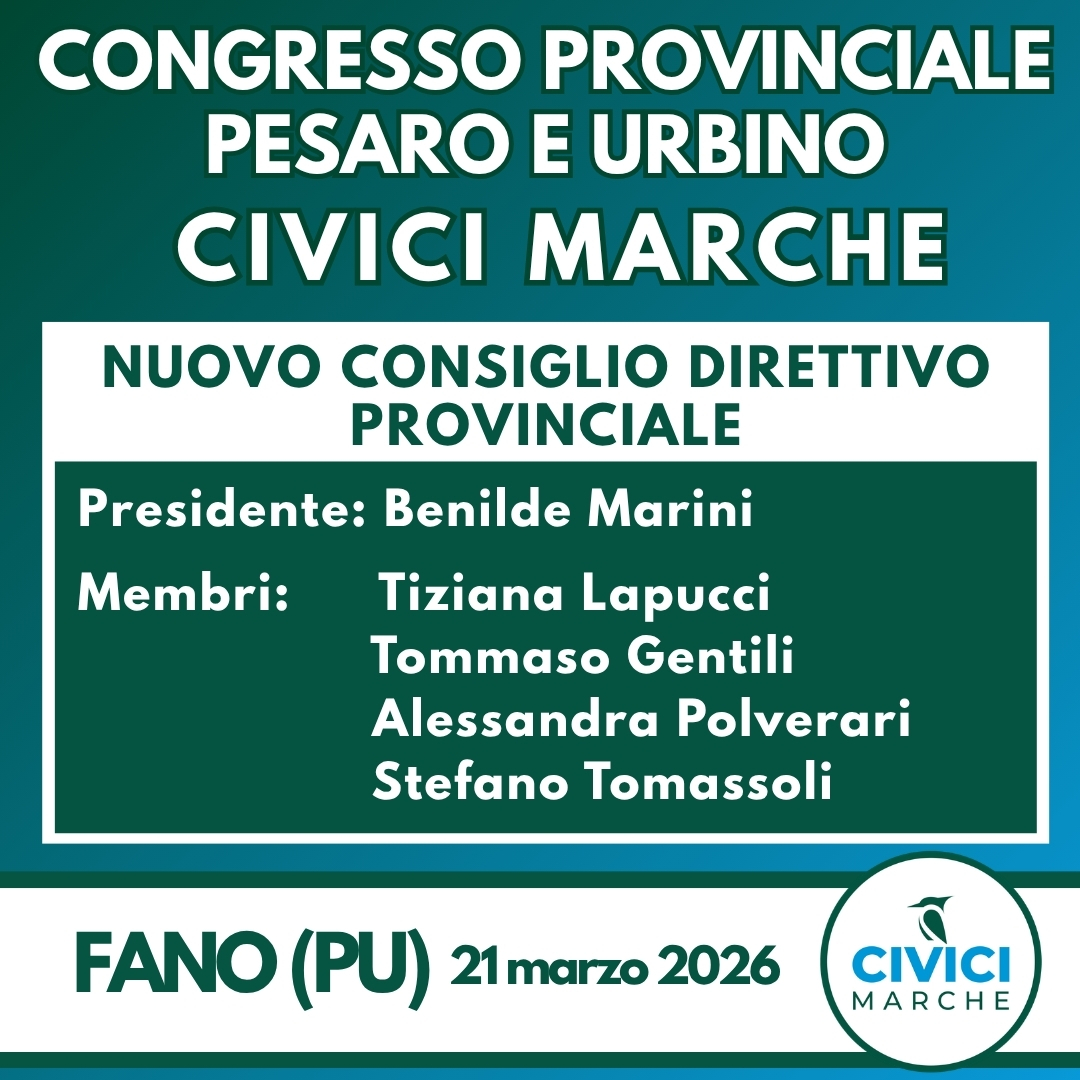 I congressi provinciali di Civici Marche, svolti il 21 marzo 2026 a Pesaro e Urbino e ad Ancona, hanno definito le nuove composizioni dei direttivi territoriali del movimento politico. A Pesaro e Urbino è stata eletta Presidente Benilde Marini, affiancata da Tiziana Lapucci, Tommaso Gentili, Alessandra Polverari e Stefano Tomassoli.